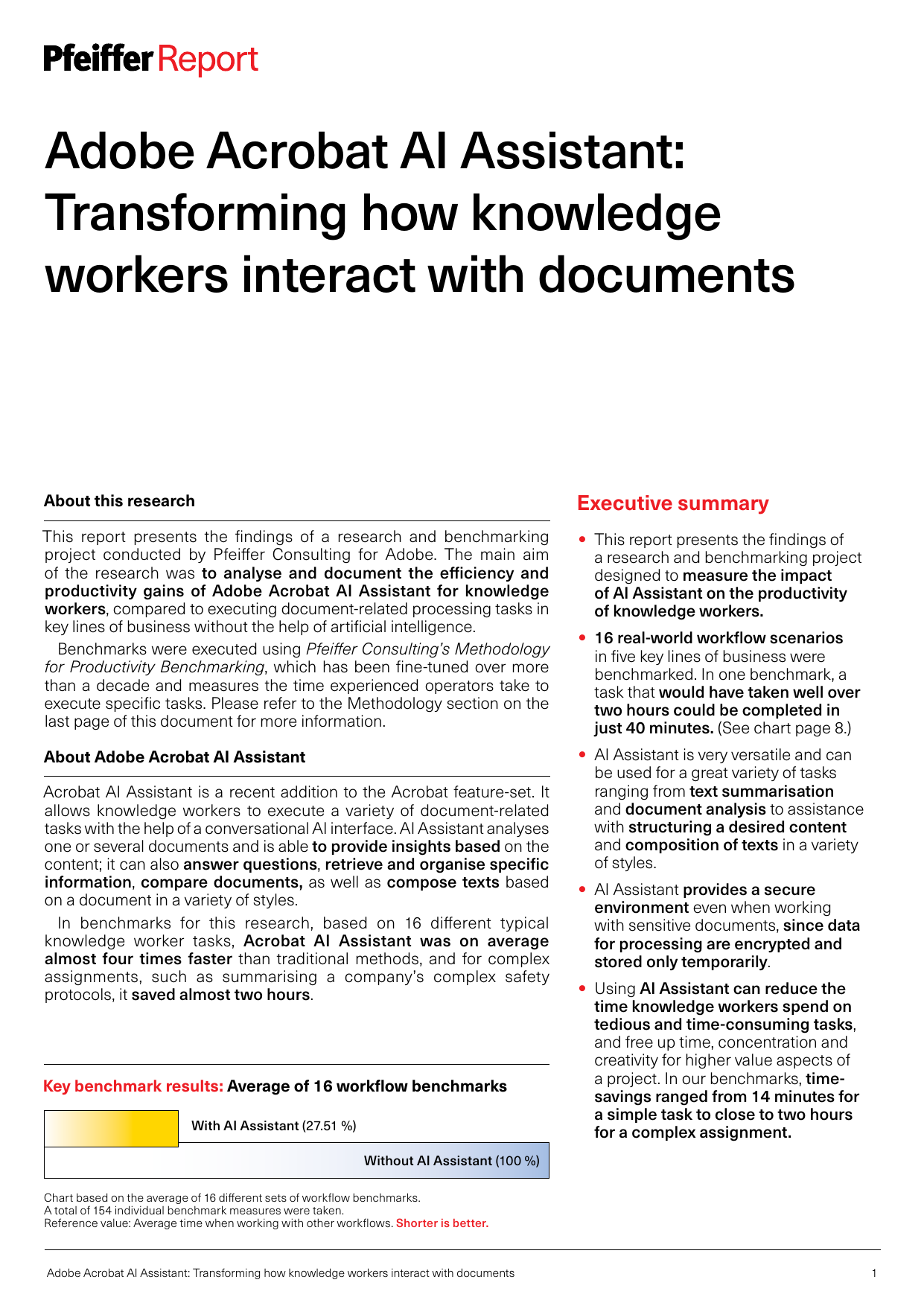 The Pfeiffer benchmarking study examines the real world impact of Adobe Acrobat AI Assistant across sixteen knowledge workflows in legal, finance, human resources, marketing, and research. By measuring tasks such as contract review, financial analysis, policy summarisation, and presentation development, the study demonstrates substantial reductions in task completion time, with complex assignments shortened by up to two hours.