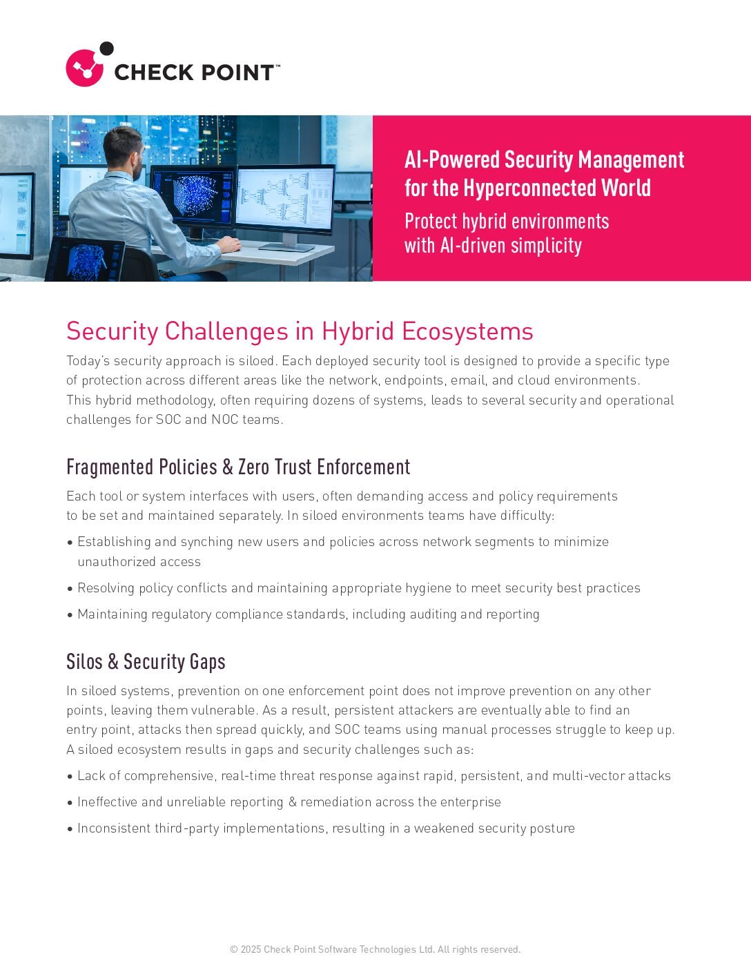This whitepaper explores how Check Point transforms fragmented, high-risk ecosystems into unified, AI-driven operations — enforcing Zero Trust, accelerating threat response, and automating compliance at scale.