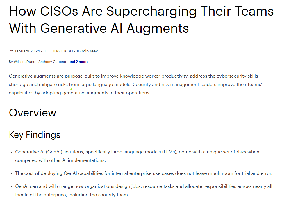 Boost your cybersecurity team capabilities with GenAI Read the Gartner report on generative AI augments. How CISOs Are Supercharging Their