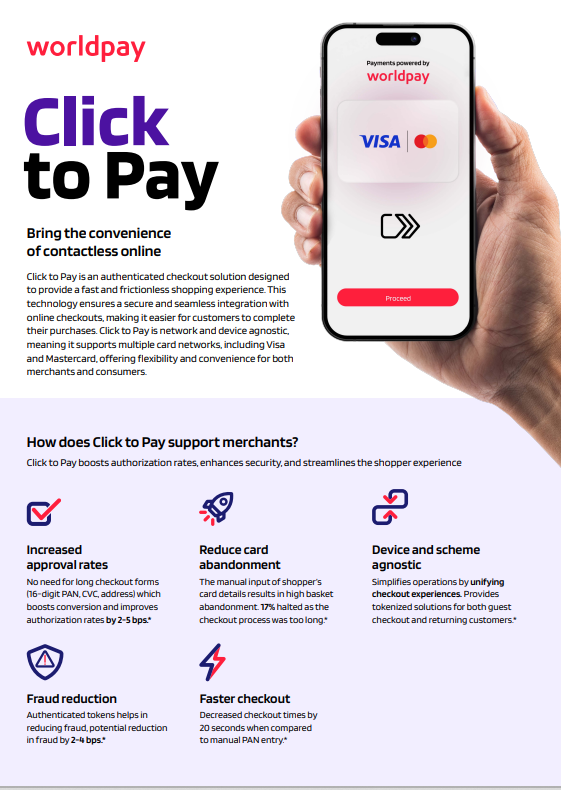 Click to Pay brochure This brochure dives into how Click to Pay helps businesses reduce friction at checkout, boost repeat