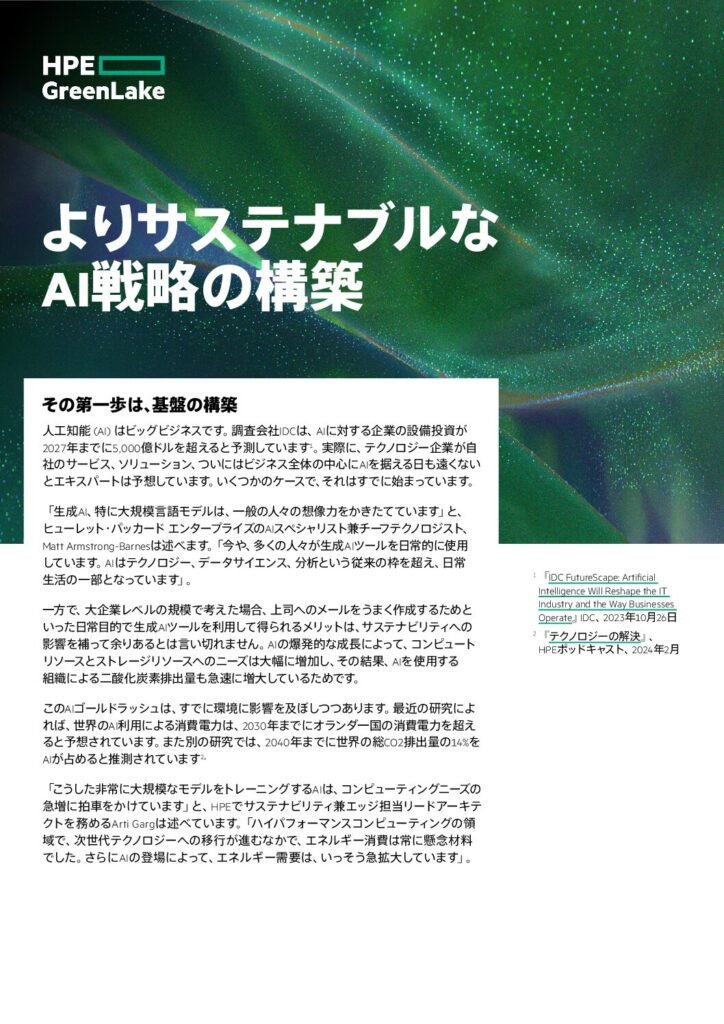 AIによる価値実現の 迅速化 新しいAIイニシアチブで迅速に対応しましょう。ハイブリッド環境とマルチクラウド環境向けに設計された分析ツールとフレームワークで、チームの能力を強化し、開発者とデータサイエンティスト間のコラボレーションを向上させます。 HPEがお客様を支援する方法についてご確認ください。 AIモデルの開発と展開を迅速化 事前構成済みのソリューションでイノベーションを迅速に推進 エッジにAIを展開してリアルタイムインサイトをキャプチャーすることで、結果をすばやく把握 生成AIおよびMLワークロードを簡素化 6399-JP-4 ways to speed ahead with AI ファーストネーム苗字Eメール会社名会社の規模選んでください…1 – 2526 – 99100 […]