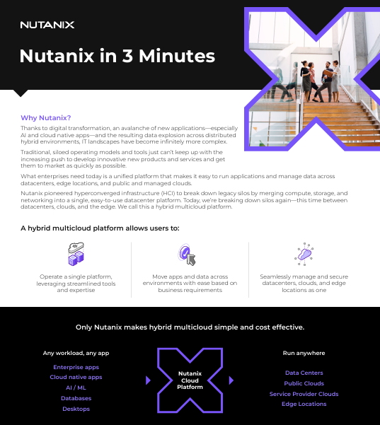 Nutanix in 3 Minutes Infographic Digital transformation has led to an explosion of AI and cloud-native applications, increasing IT complexity.
