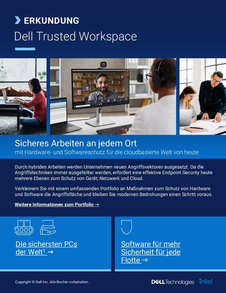 Dell Trusted Workspace Durch hybrides Arbeiten werden Unternehmen neuen Angriffsvektoren ausgesetzt. Da die Angriffstechniken immer ausgefeilter werden, erfordert eine effektive