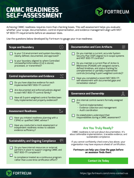 This self-assessment from Fortreum helps organizations evaluate their scope, control implementation, governance structure, and evidence management to determine whether they are truly prepared for a CMMC assessment.