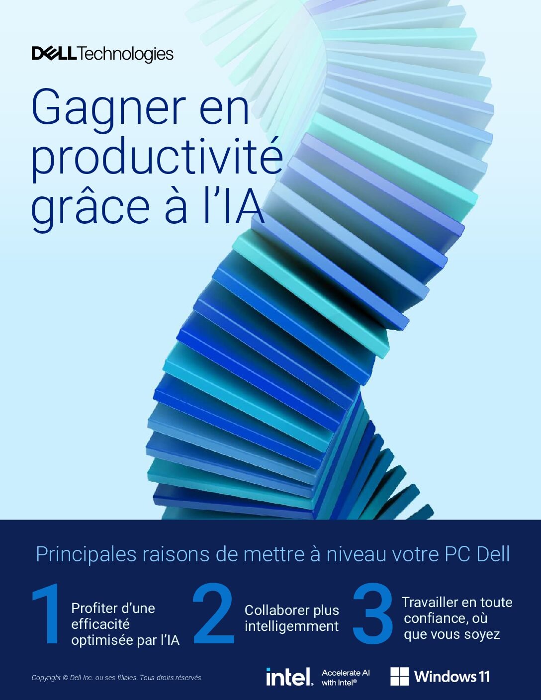 Les ordinateurs commerciaux de Dell sont équipés de processeurs d’IA intégrés, ce qui améliore la productivité, la collaboration et la sécurité. Des outils alimentés par l’IA tels que Copilot et Dell Optimizer améliorent l’exécution des tâches et les expériences de conférence. L’intégration de la télémétrie matérielle à la cybersécurité basée sur l’IA garantit une protection robuste, tandis que la confidentialité et les performances sont maintenues dans les pare-feu. Ces avancées contribuent à réduire les coûts d’assistance et les efforts du service d’assistance.