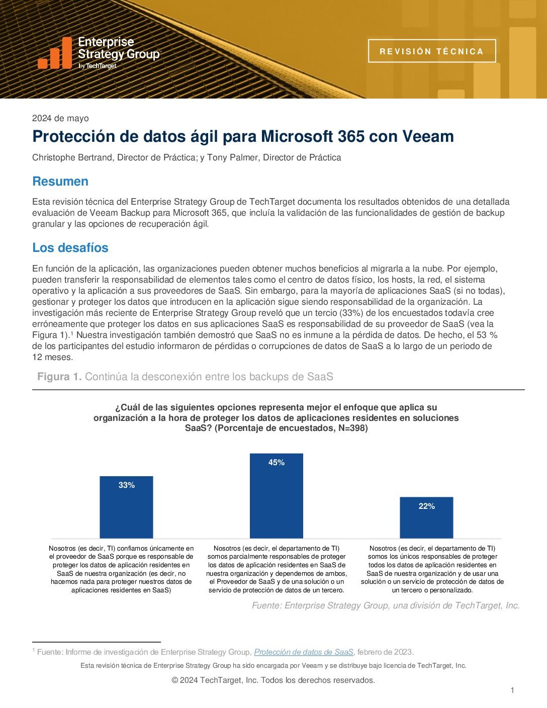 Consulte la revisión técnica de ESG en profundidad de las soluciones de backup de Microsoft 365 de Veeam que muestra una gestión de backup granular validada y opciones de recuperación ágiles.