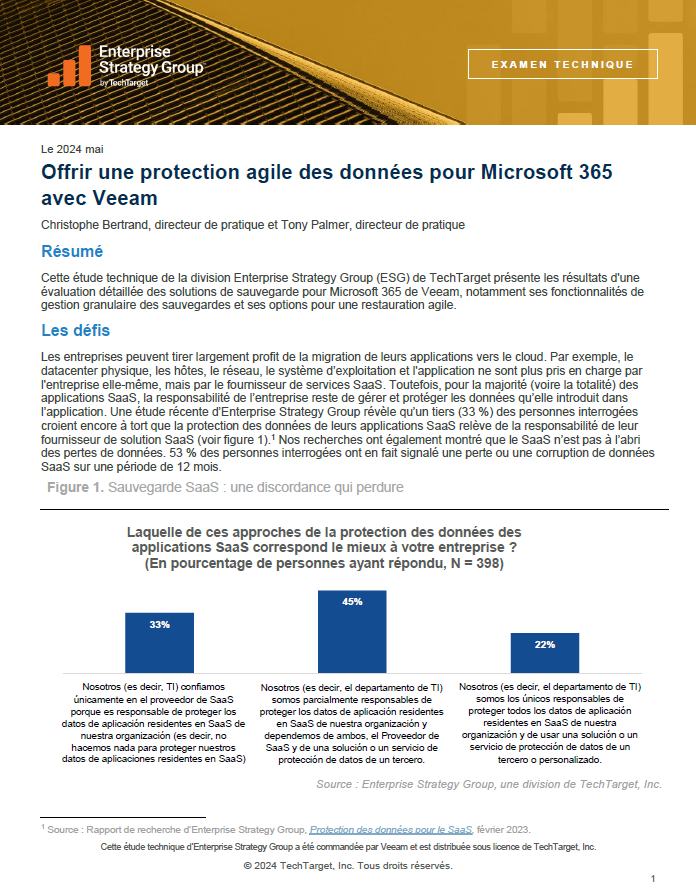 Cette étude technique de la division Enterprise Strategy Group de TechTarget présente les résultats d’une évaluation détaillée des solutions de sauvegarde de Microsoft 365 de Veeam, notamment ses fonctionnalités de gestion granulaire des sauvegardes et ses options pour une restauration agile.