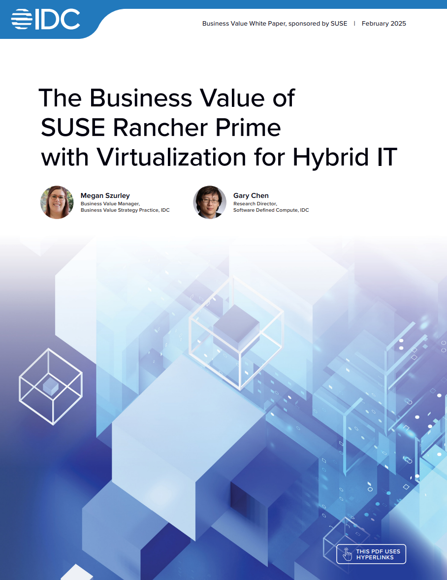 Containers may dominate headlines, but Virtual Machines are here to stay. IDC’s research shows that SUSE Rancher Prime with Virtualization unifies both worlds -delivering consistency, efficiency, and agility across hybrid IT.