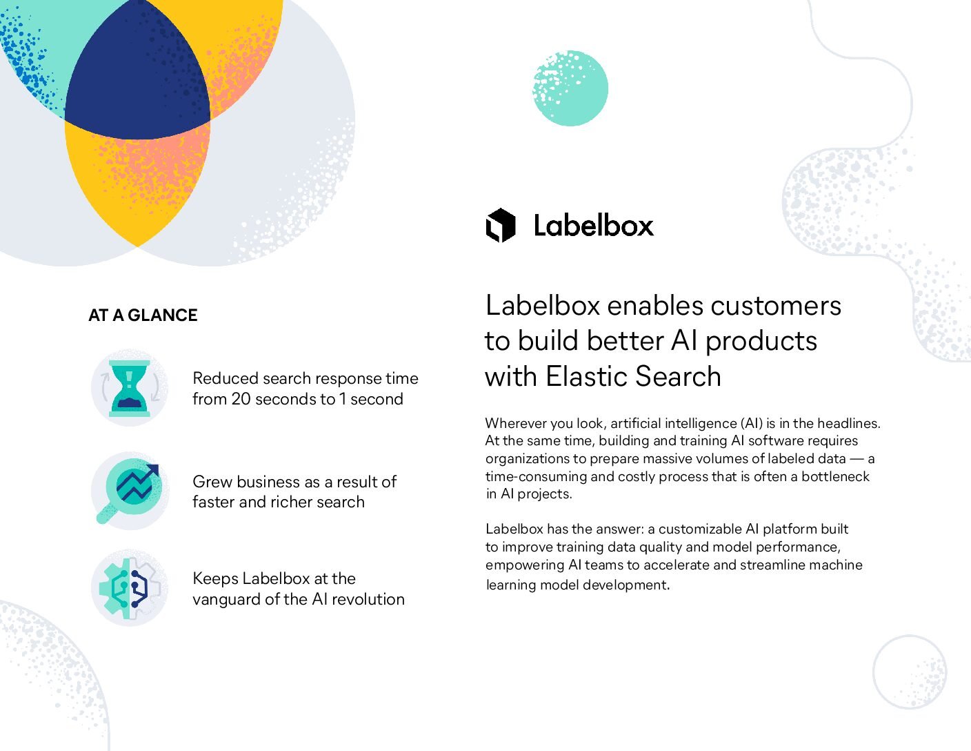 Labelbox built a customizable AI platform on Elastic designed to enhance training data quality and model performance for their Catalog solution, helping AI teams accelerate machine learning development. After the deployment of Elasticsearch, search times improved drastically to about one second, enabling complex searches and sophisticated analytics for better data curation decisions.