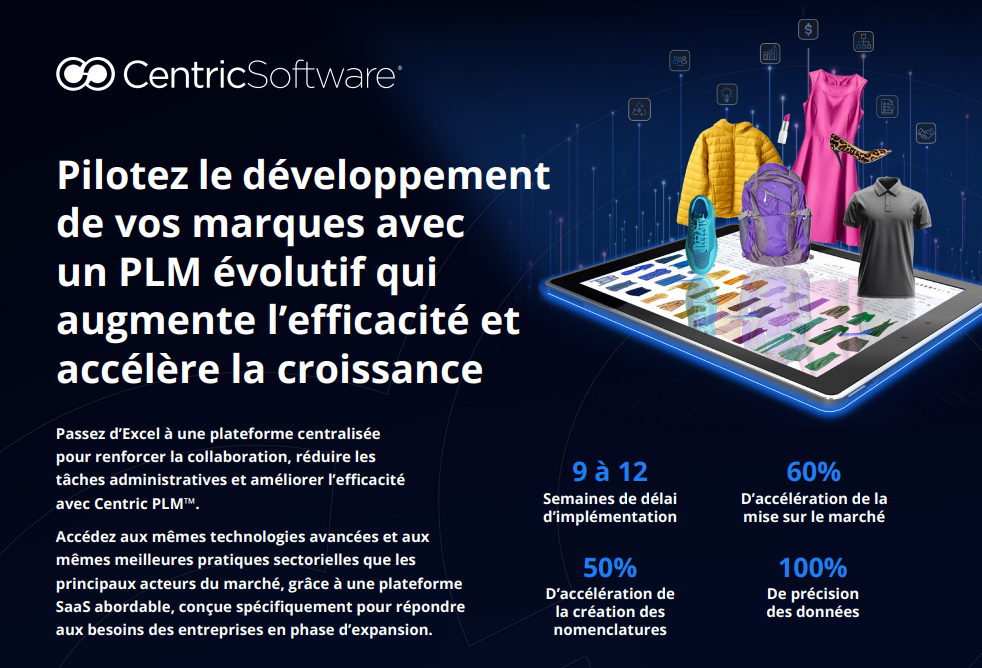 Pensée pour les marques émergentes dans la mode, la chaussure, l’outdoor, les biens de consommation et l’univers maison, la solution Centric Software® regroupe tous les outils essentiels pour se développer plus vite, plus intelligemment et de façon plus durable — sur une seule plateforme centralisée et accessible.