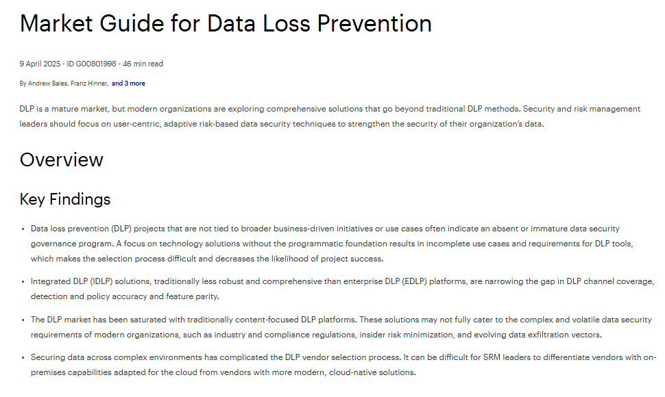 Explore the 2025 Gartner® Market Guide for Data Loss Prevention. Get independent, expert insights on market trends and recommendations. Learn about key features needed to future-proof data protection. And confidently find a DLP offering that’s ideal for you.