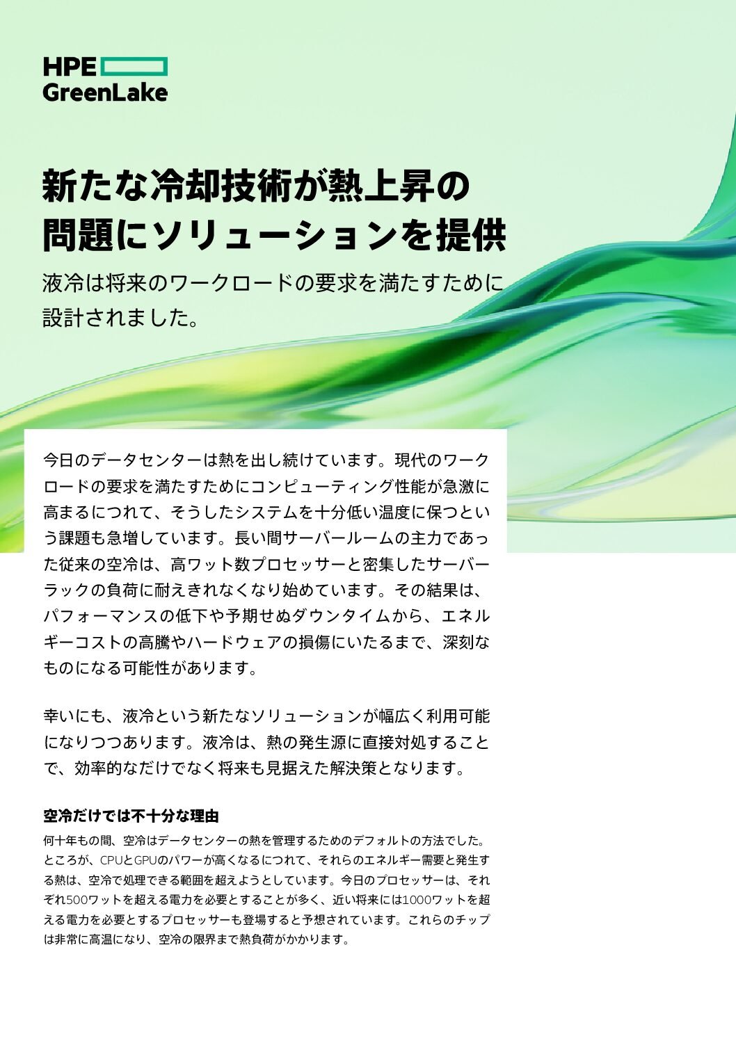 上昇する温度への対応課題を解消する新たな冷却技術。最新のワークロード ニーズに対応するためにコンピューティング性能が急速に向上すると同時に、これらのシステムの温度を常時適切に冷却するニーズも急拡大しています。空冷は長年、データセンターにおける熱管理の標準的な手法でした。しかし、CPU、GPU性能の向上に伴って発生する熱とエネルギー需要に、空冷では対応しきれなくなっています。液冷は、効率的なだけでなく将来も見据えた、先進的なアプローチです。