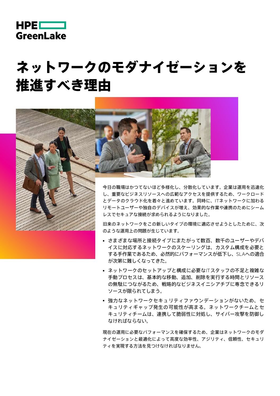 ネットワークのモダナイゼーションとは、単に次世代のテクノロジーに合わせて現在のインフラストラクチャを更新することではありません。アジャイルなネットワーク基盤の構築は、不可欠かつ継続的なプロセスで、アーキテクチャー、セキュリティ、管理、デリバリに対する新しいアプローチを活用することで、組織の能力を高め、デジタルトランスフォーメーションのイニシアチブを迅速に実施します。最新のネットワークは、実現できない未来の課題ではありません。ユニバーサルなネットワークの可視性と制御性を実現する手順とその利点をご覧ください。