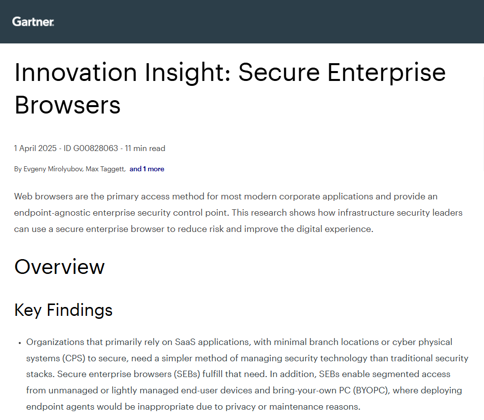 The latest research from Gartner®, Innovation Insight: Secure Enterprise Browsers, highlights the use cases and benefits of deploying secure enterprise browsers, including: