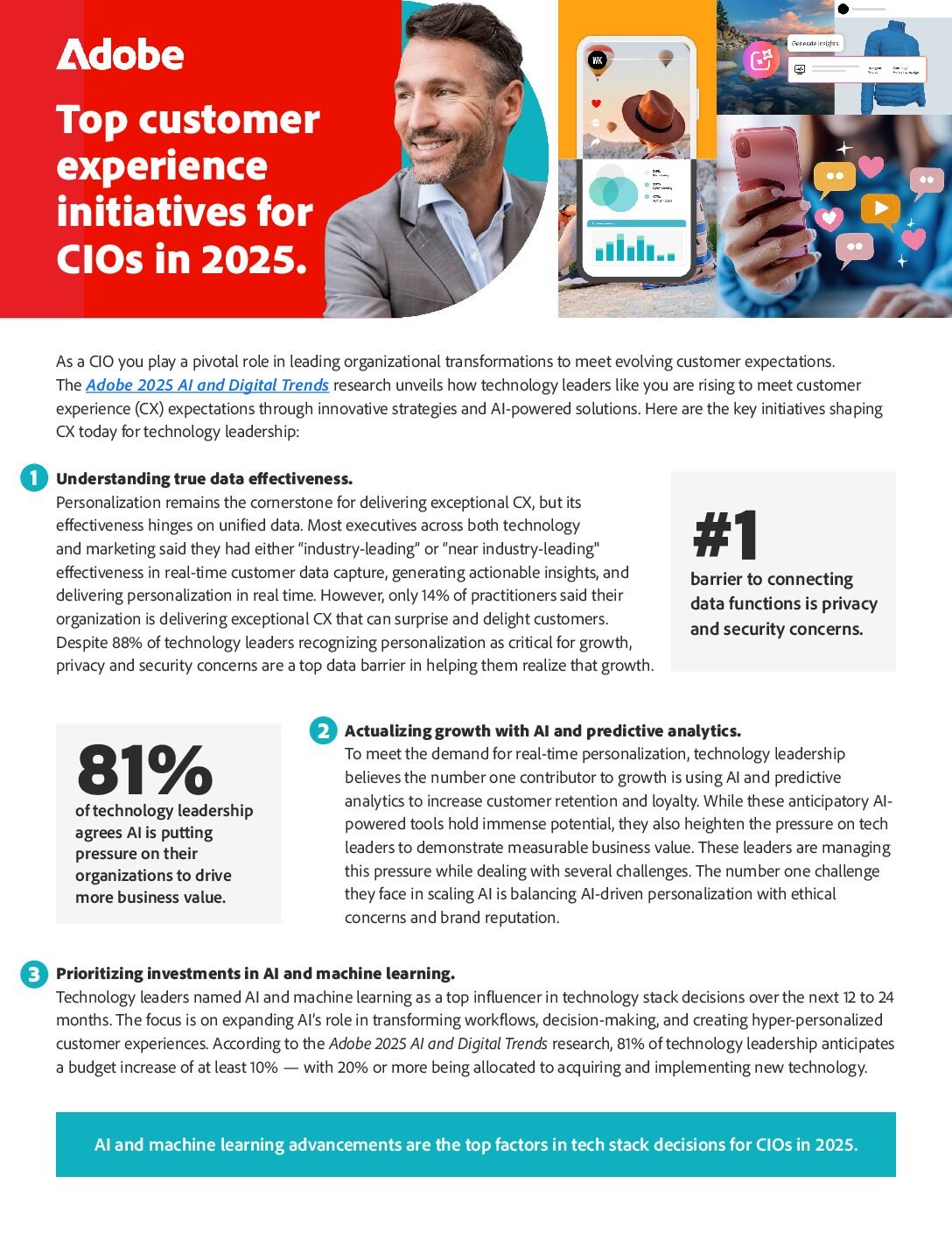 The Adobe 2025 AI and Digital Trends research unveils how technology leaders are rising to meet customer experience (CX) expectations through innovative strategies and AI-powered solutions. View the key initiatives shaping CX today for CIOs.