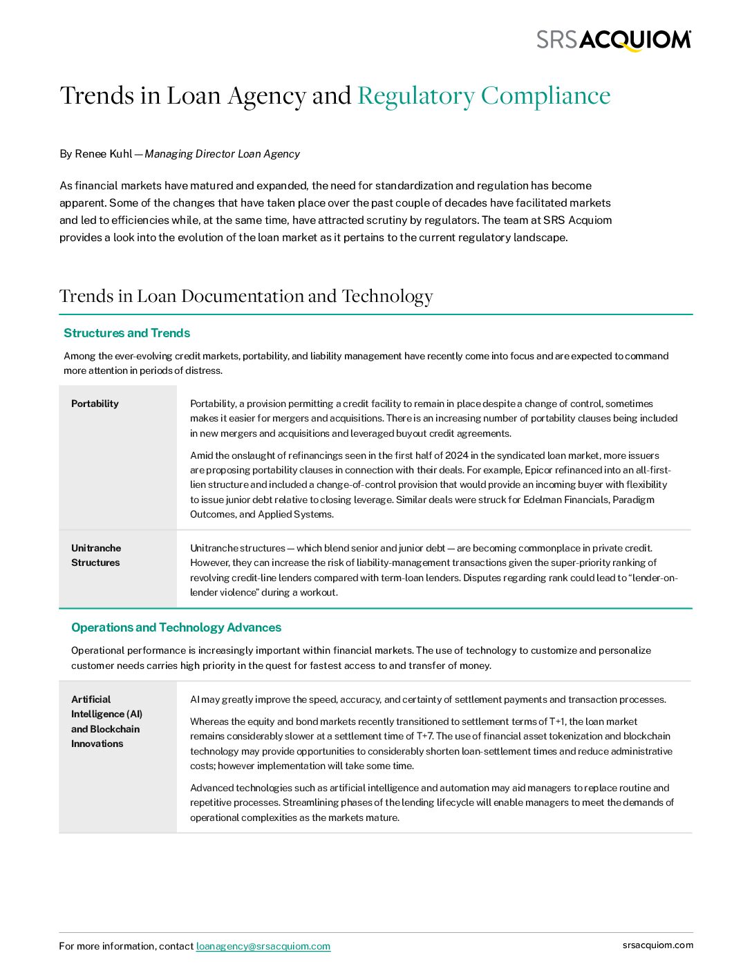 The whitepaper by SRS Acquiom explores the transformative trends shaping loan agency and regulatory compliance. It highlights emerging structures like portability and unitranche loans, the role of advanced technologies such as AI and blockchain in enhancing efficiency, and the push for automation in loan documentation and servicing.